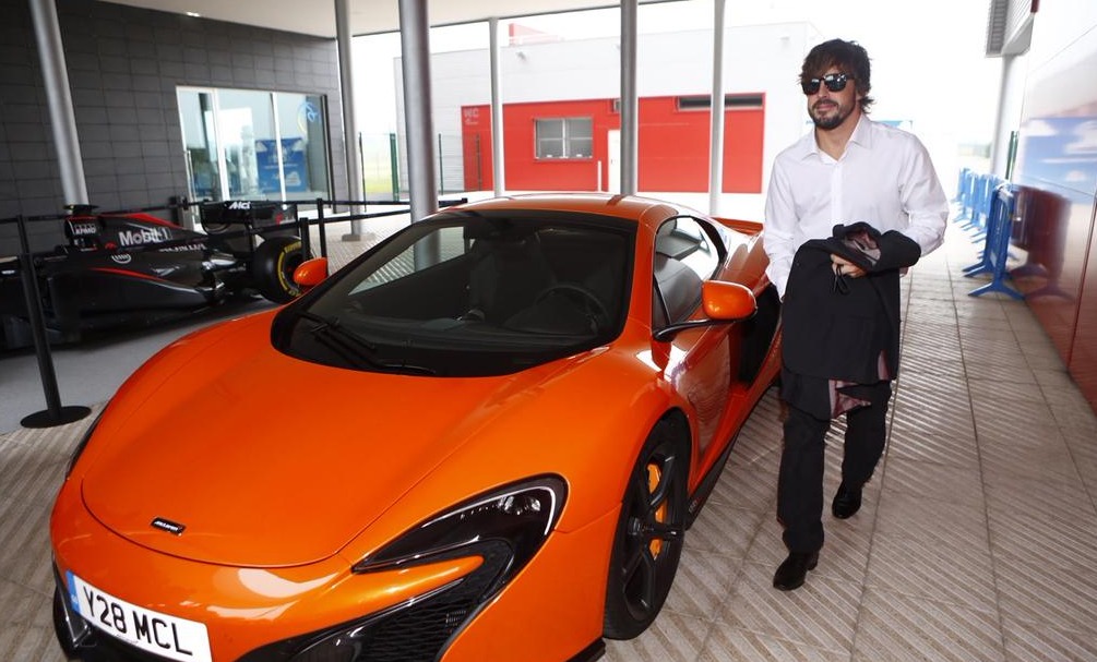 Fernando Alonso, posando entre el Renault de 2008 y el McLaren de 2007.