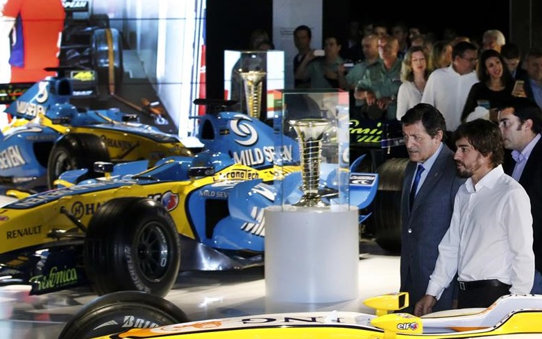 Fernando Alonso y el presidente en funciones del Principado de Asturias, Javier Fernández, pasan delante del Renault de 2005 con el que el ovetense ganó su primer título mundial.