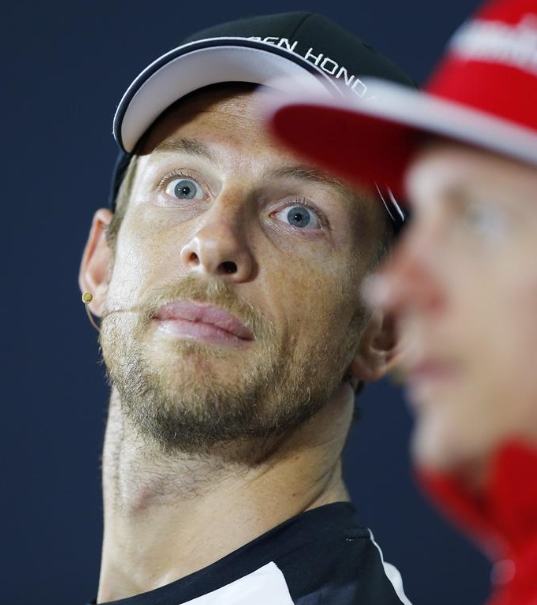 Jenson Button, compañero de Fernando Alonso en McLaren, aparece en rueda de prensa junto al finlandés Kimi Raikkonen (Ferrari).