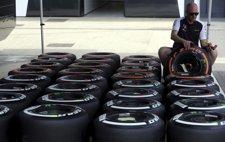 Un mecánico del equipo McLaren-Honda comprueba los neumáticos en el circuito de Silverstone.
