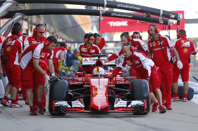 Un grupo de mecánicos empuja el monoplaza del piloto alemán Sebastian Vettel (Ferrari) durante la primera sesión de entrenamientos libres.