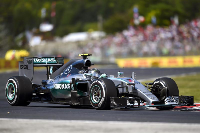 El de Hungría es el primer gran premio después del fallecimiento del piloto francés Jules Bianchi tras permanecer nueve meses en coma. En la imagen, vista del morro del monoplaza de Nico Rosberg con las iniciales de Bianchi y el dorsal que llevaba en el Mundial.
