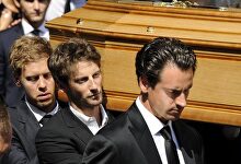 Sebastian Vettel (i) y Romain Grosjean portan el féretro con los restos mortales de Jules Bianchi. | EFE