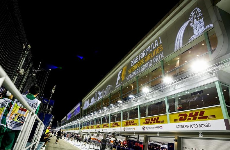 Vista de los garajes de los equipos en el circuito urbano de Marina Bay.