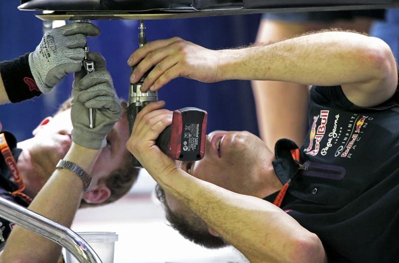 Dos mecánicos del equipo Red Bull, poniendo los monoplazas a punto de cara al gran premio.