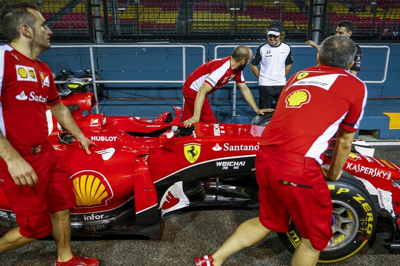 Los mecánicos de Ferrari retiran el coche de Vettel tras la pole del piloto alemán.
