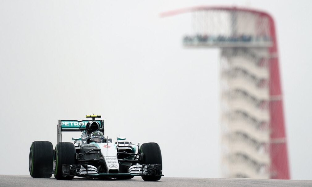 El alemán Nico Rosberg (Mercedes) marcó el mejor tiempo este viernes en el primer ensayo libre para el Gran Premio de Estados Unidos, la decimosexta prueba del Mundial de Fórmula Uno, que se disputó en Austin (Texas), con la pista mojada por las fuerte lluvias que cayeron las horas previas.