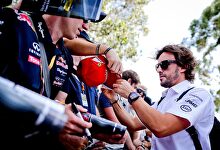 Fernando firma una gorra de Ferrari en Australia. | EFE Fernando Alonso: "Si Ferrari gana el Mundial, me arrepentiré de mi salida" El piloto español reconoce que si la escudería italiana gana este año pensaría en el año de contrato que le restaba con ellos.