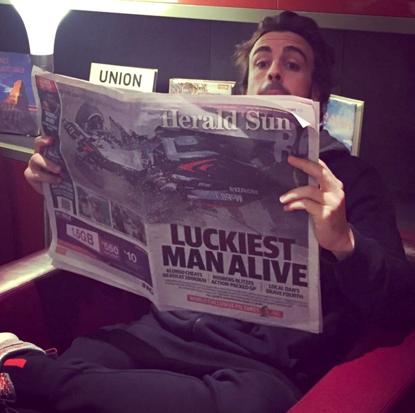 El Herald Sun describe como "el hombre más afortunado del mundo" en su portada a doble página de este lunes al piloto español Fernando Alonso (McLaren-Honda), quien salió ileso del brutal accidente que sufrió este domingo durante el Gran Premio de Australia, primera cita del Campeonato del Mundo de Fórmula Uno.