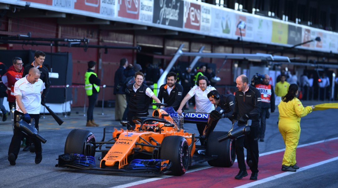El séptimo día de entrenamientos en Montmeló dejó una curiosa imagen en una parada de Stoffel Vandoorne, con un desastroso pit-stop por parte de los mecánicos de McLaren.