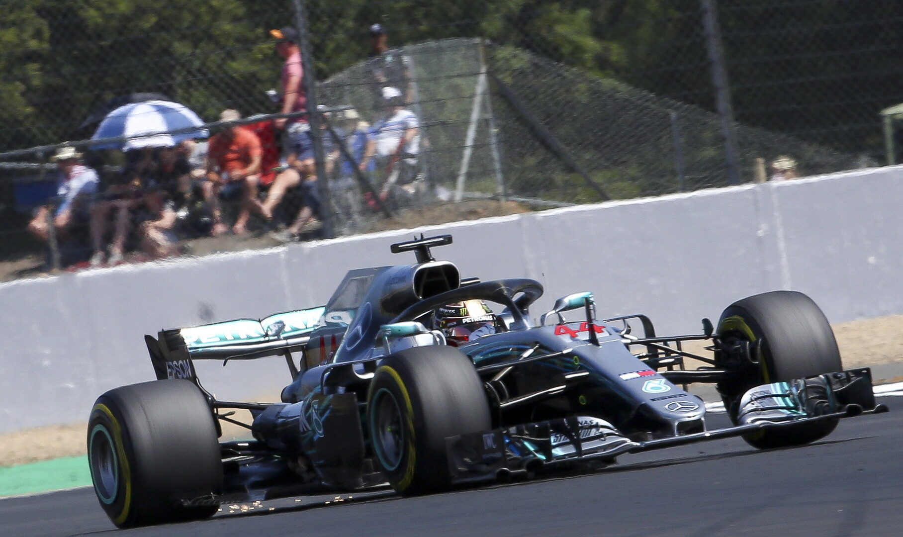 En una jornada calurosa, con casi 50 grados sobre el asfalto, la Q3 vivió otra batalla entre Hamilton y Vettel por hacerse con los mejores puestos y ganar confianza para la carrera dominical. La 'pole' del inglés se fraguó casi sobre la bocina, arrebatando el mejor crono al alemán por apenas 44 milésimas y a la espera de Raikkonen finiquitara su último recorrido por Silverstone.