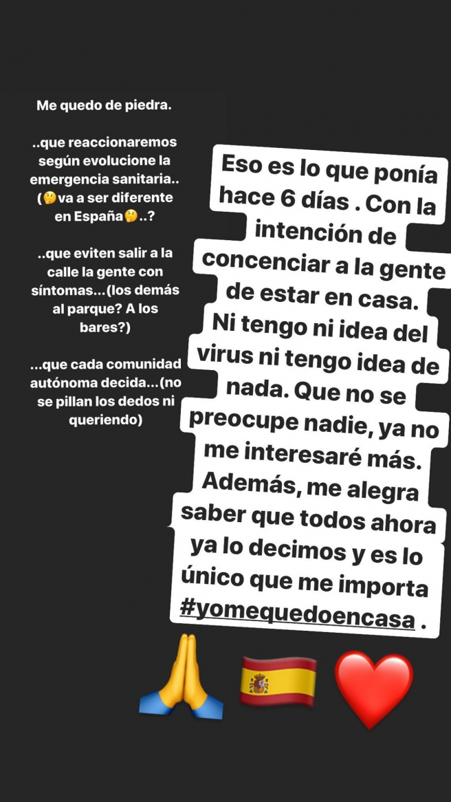 "Eso es lo que ponía hace 6 días. Con la intención de concienciar a la gente de estar en casa. Ni tengo ni idea del virus ni tengo ni idea de nada. Que no se preocupe nadie, ya no me interesaré más. Además, me alegra saber que todos ahora ya lo decimos y es lo único que me importa", escribió en un 'storie' de instagram, que finaliza con el hashtag #YoMeQuedoEnCasa.