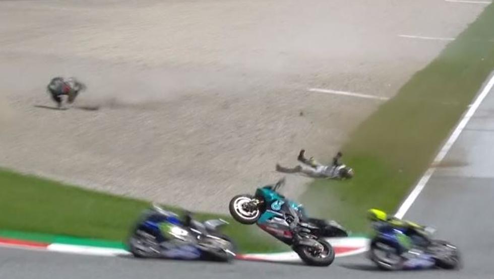 Ambos impactaron y se cayeron al suelo lo que acabó provocando que sus monturas salieran volando de nuevo dentro de la pista. Allí las dos motos pasaron rozando a Rossi y Viñales que no impactaron por centímetros.