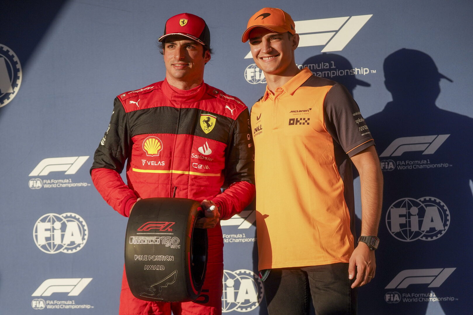 Sainz logró la tercera pole de su vida hasta ahora con un tiempo de 1:34.356, 65 milésimas mejor que su compañero Charles Leclerc, pero el monegasco tiene una penalización de 10 posiciones en parrilla del domingo por cambios en el motor. Así, a la vera del español en primera línea saldrá Verstappen.