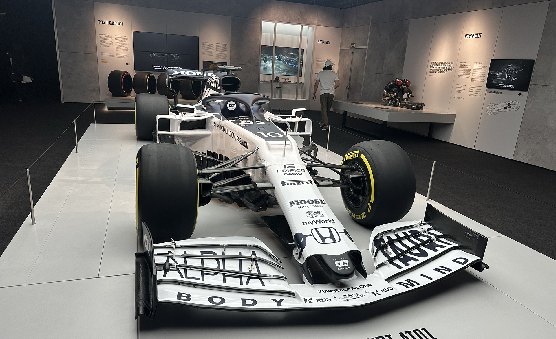 La exposición repasa la historia de la categoría reina, pero no destaca ningún piloto. Lucía Prieto le preguntaba a Harvey por esta cuestión y el comisario respondía que "la intención es mostrar la Fórmula 1 sin dejar a nadie fuera". Los pasillos de la exposición respiran gasolina. Lo primero que aparece en una serie de imágenes de grandes personalidades históricas. A continuación aparece un monstruo y es por su tamaño: el Alpha Tauri con el que Pierre Gasly ganó su primera y única carrera en Fórmula 1.