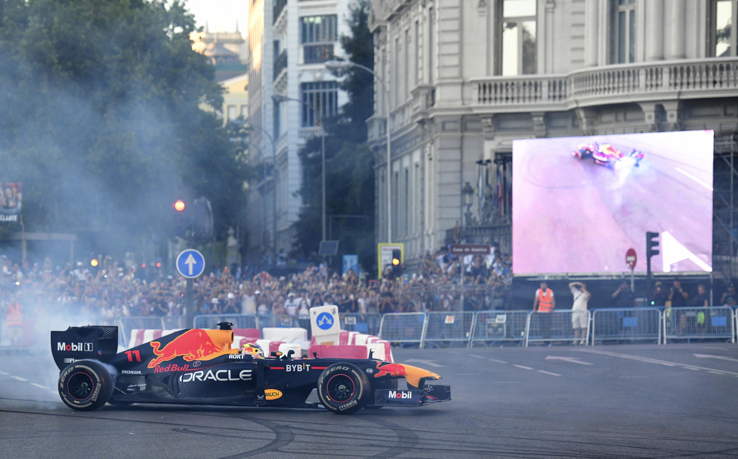 El piloto mexicano Sergio Checo Pérez, del equipo Red Bull Racing, protagonizó este sábado por la noche el evento Red Bull Showrun por la Comunidad de Madrid, una exhibición sobre su bólido de Fórmula 1 y que culminó con un recorrido por calles más emblemáticas de la capital española.