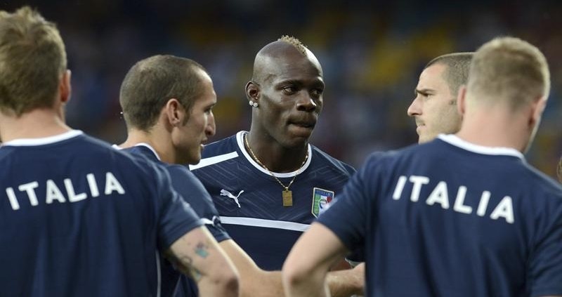 Balotelli, concentrado, habla con Chiellini antes del partido.