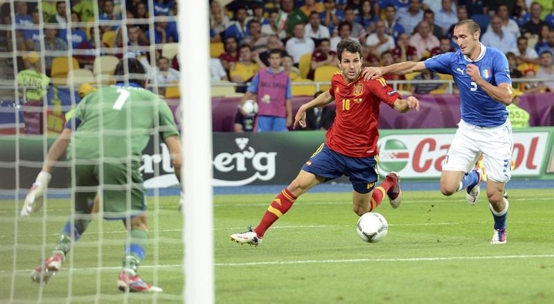 Cesc asiste a Silva ante la presión de Chiellini.