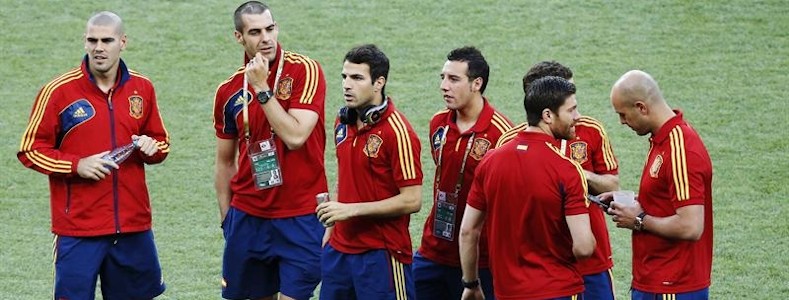 Algunos de los jugadores de la selección española de fútbol charlan antes de la gran final.