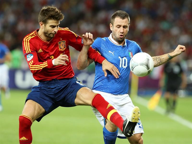 Piqué lucha por el balón con el italiano Antonio Cassano.