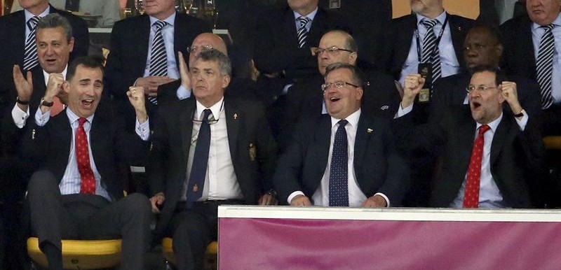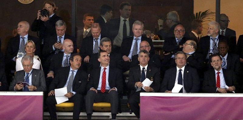 El príncipe de Asturias, acompañado por el primer ministro italiano, Mario Monti (i), el presidente de la UEFA, Michel Platini (2i), el presidente de la Federación Española de Fútbol, Angel María Villar (3d) y el presidente del Gobierno, Mariano Rajoy (d), entre otros.