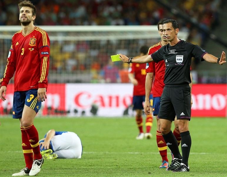 El árbitro portugués de la final Pedro Proença amonesta a Piqué en la primera parte.