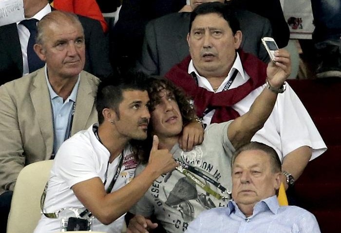 Los jugadores del FC Barcelona y de la selección española David Villa (i) y Carles Puyol.
