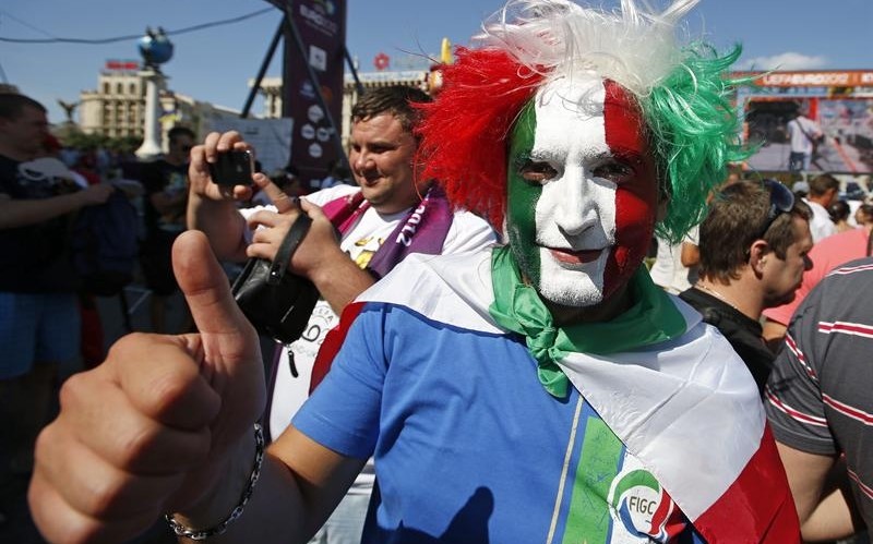 Aficionados italianos animan a la selección en el centro de la ciudad ucraniana de Kiev.