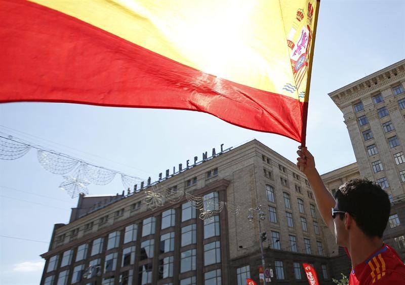 Aficionados españoles animan a la selección en el centro de la ciudad ucraniana.