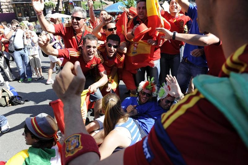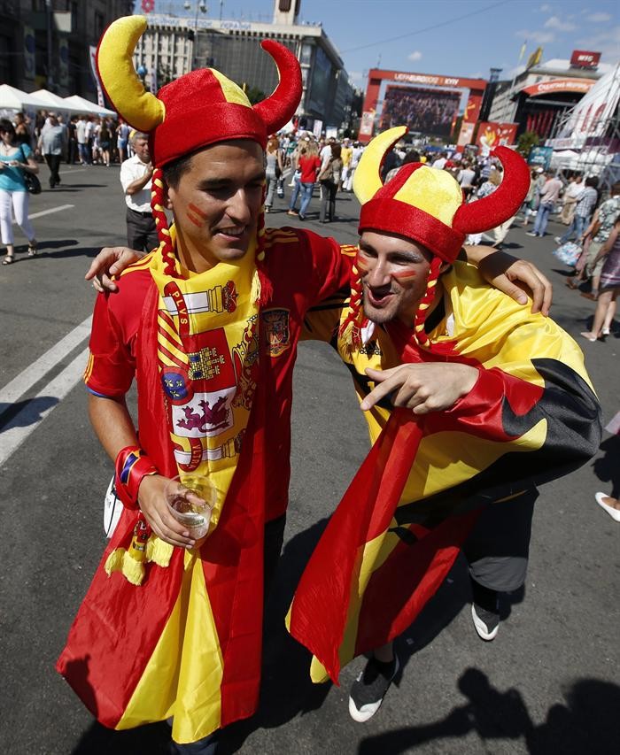 Como no podía ser de otra manera, aficionados italianos y españoles se divierten juntos antes de la final.