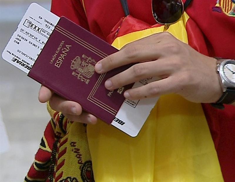 Un aficionado español con su pasaporte y su tarjeta de embarque en el aeropuerto de Madrid-Barajas.
