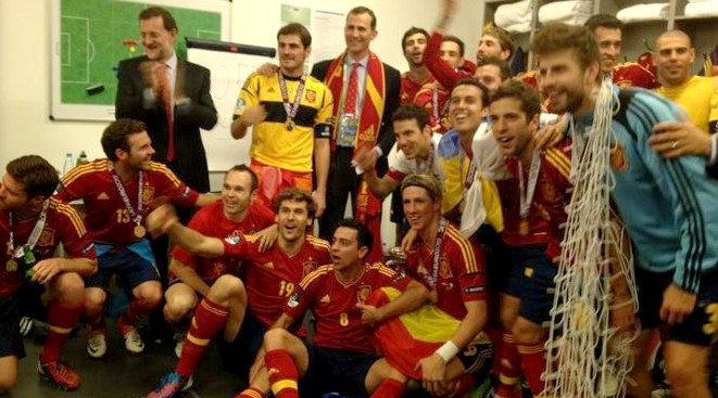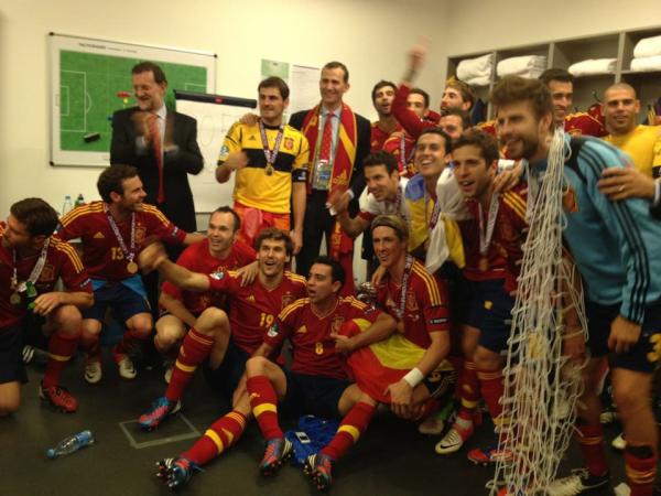 El grueso del equipo, junto al Príncipe Felipe y Mariano Rajoy, celebrando el triunfo dentro del vestuario.