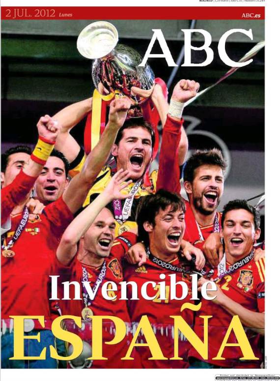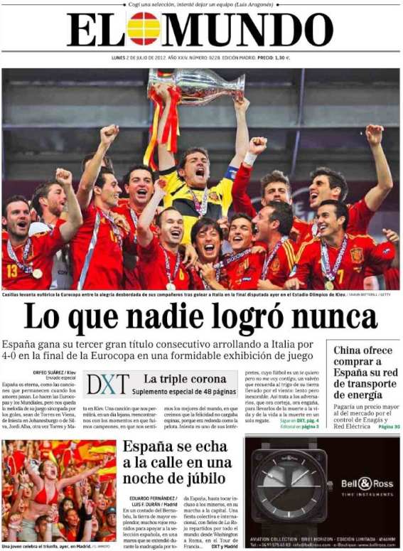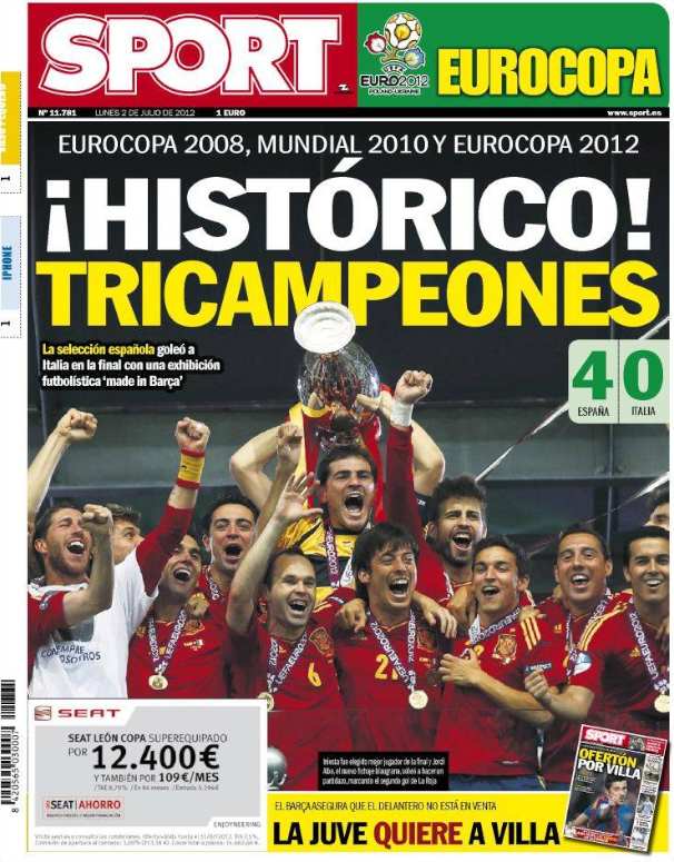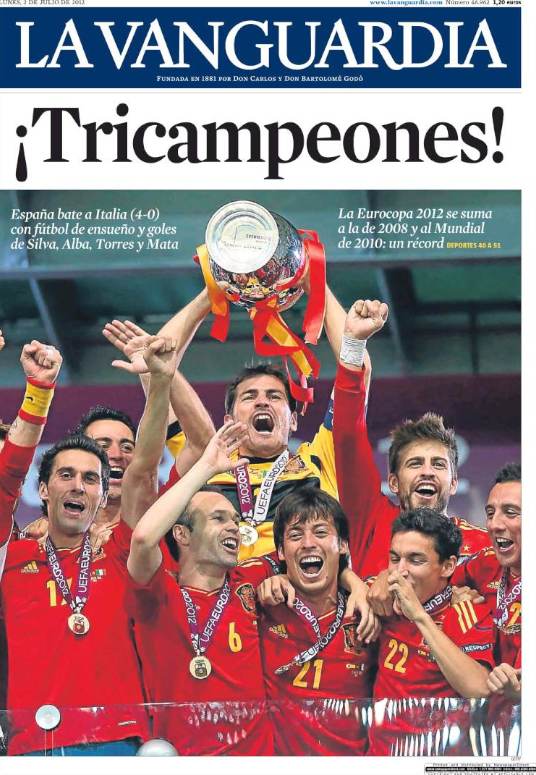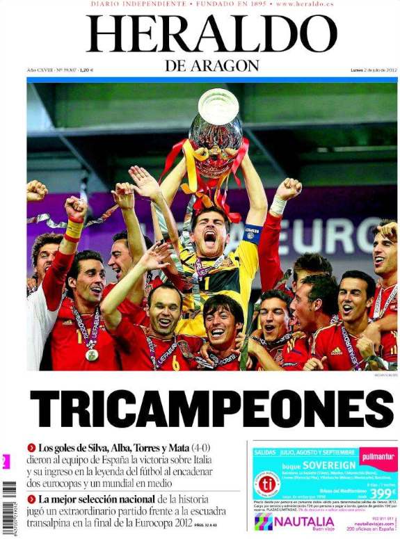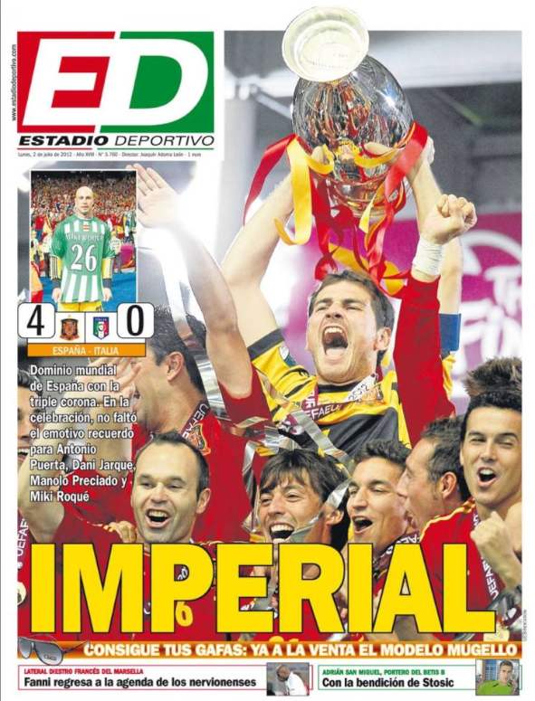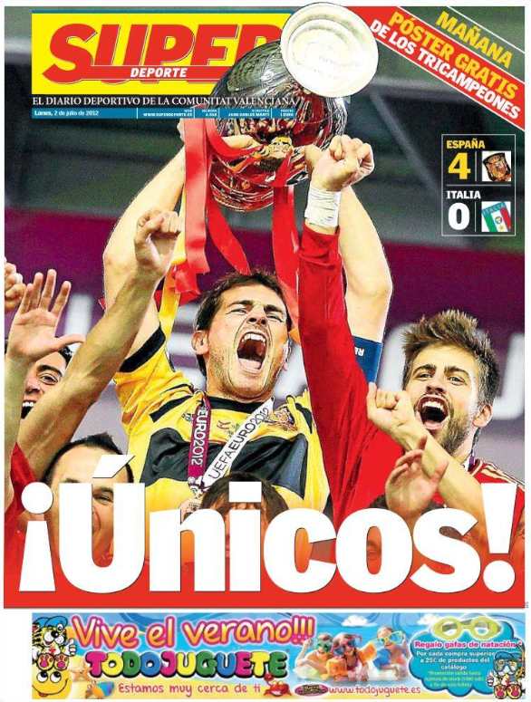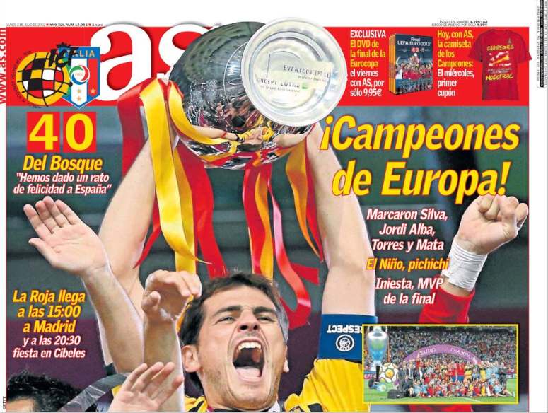 Apenas se habla hoy de otra cosa. La imagen de Iker Casillas levantando el trofeo que acredita a la selección española como campeona de la Eurocopa por tercera vez en su historia, tras arrollar a Italia en la final de Kiev, manda en las portadas de los diarios deportivos y de información general.