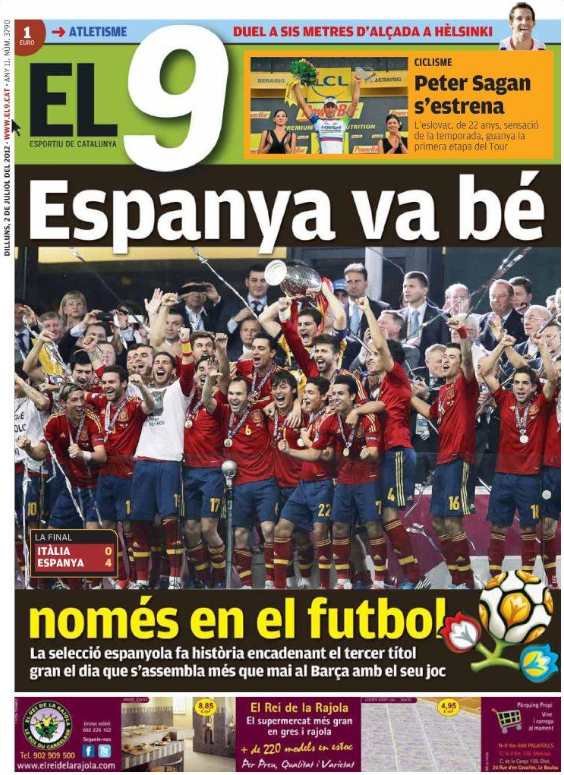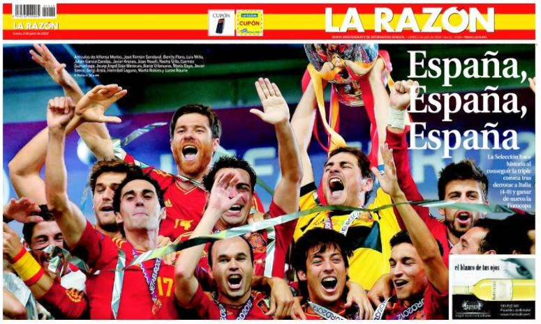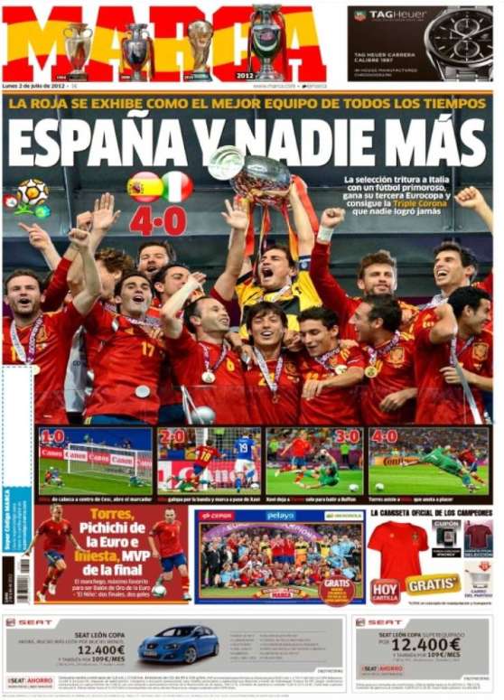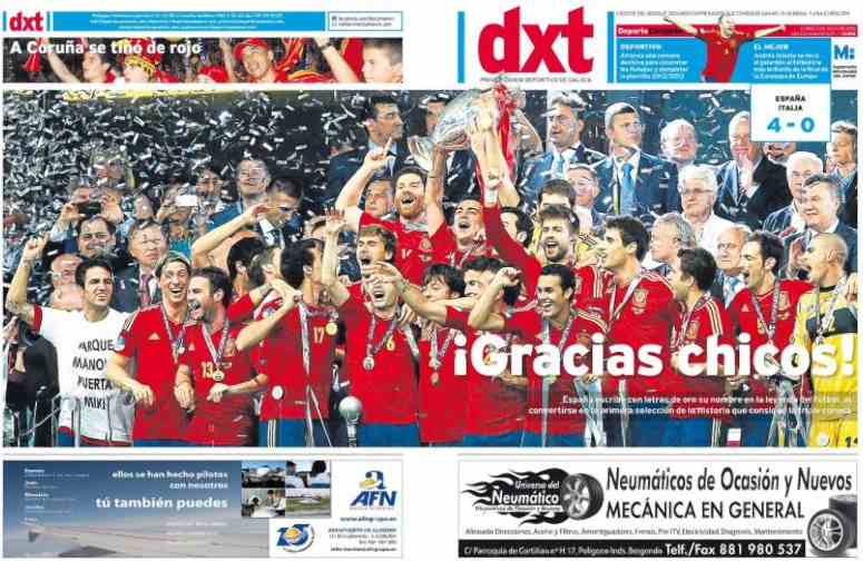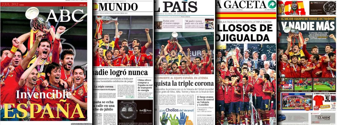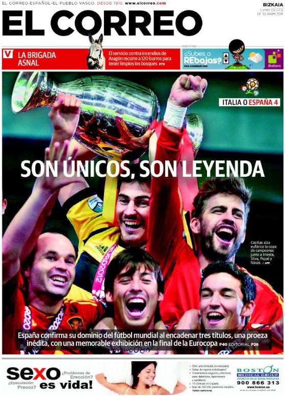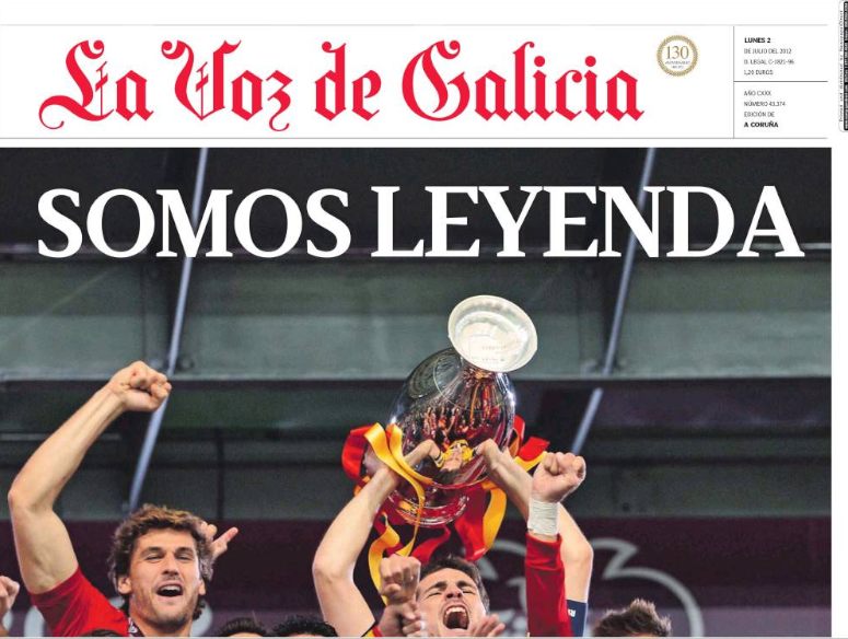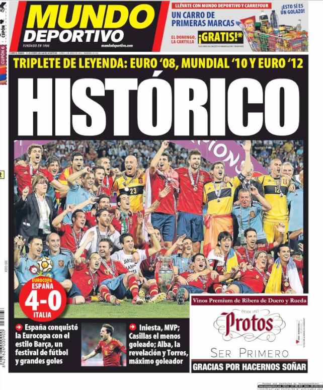 Apenas se habla hoy de otra cosa. La imagen de Iker Casillas levantando el trofeo que acredita a la selección española como campeona de la Eurocopa por tercera vez en su historia, tras arrollar a Italia en la final de Kiev, manda en las portadas de los diarios deportivos y de información general.