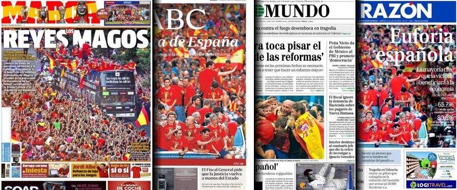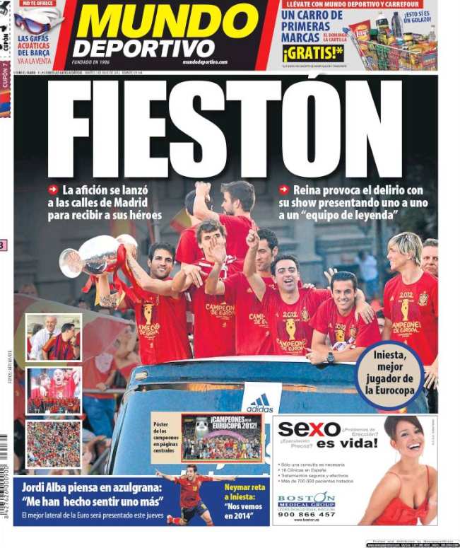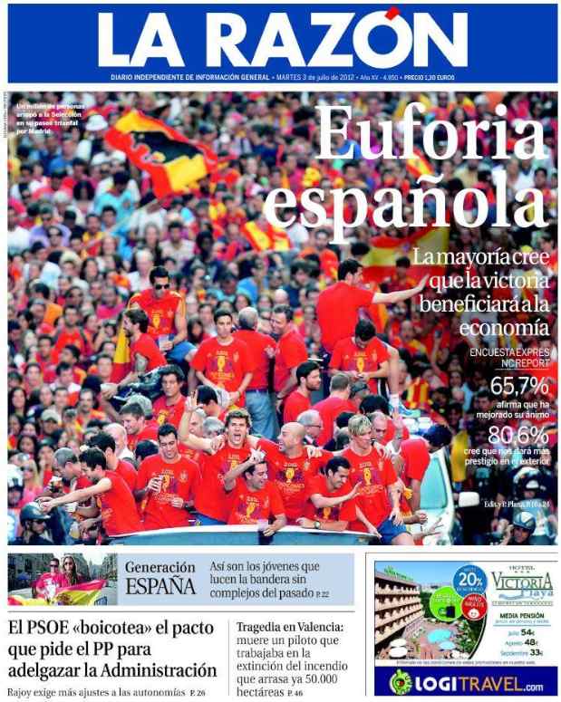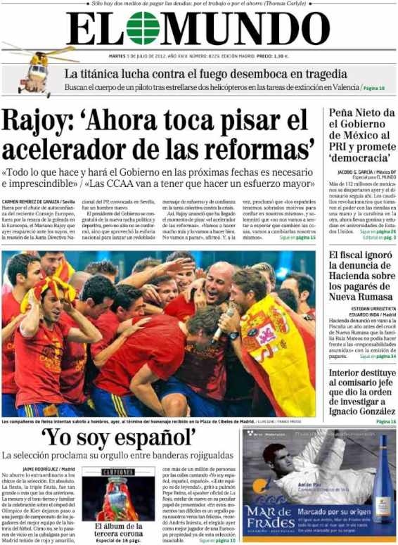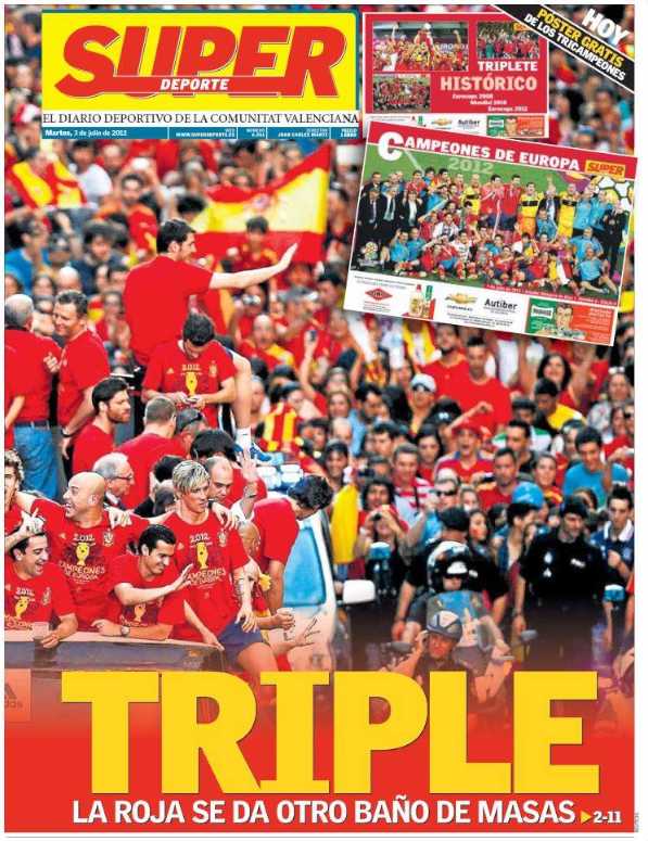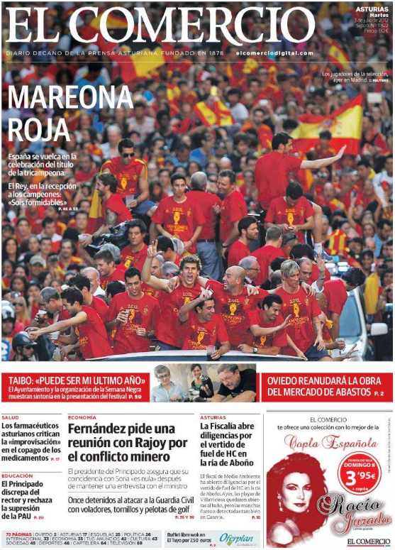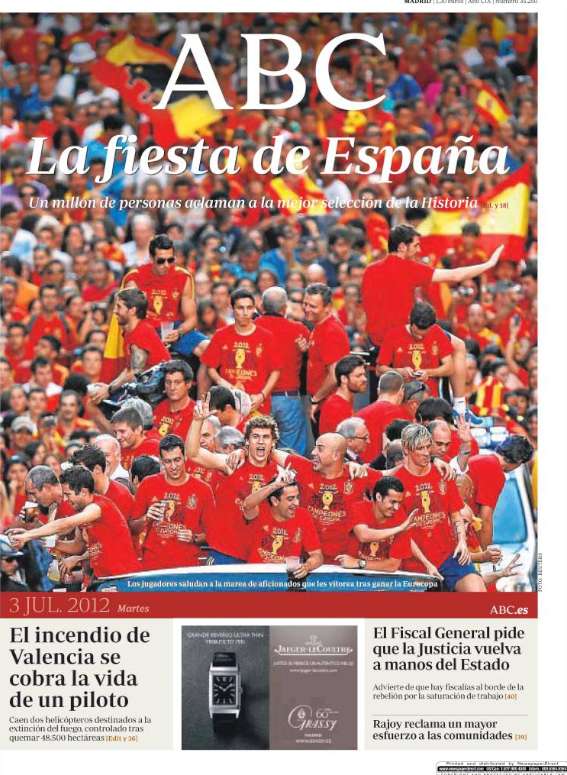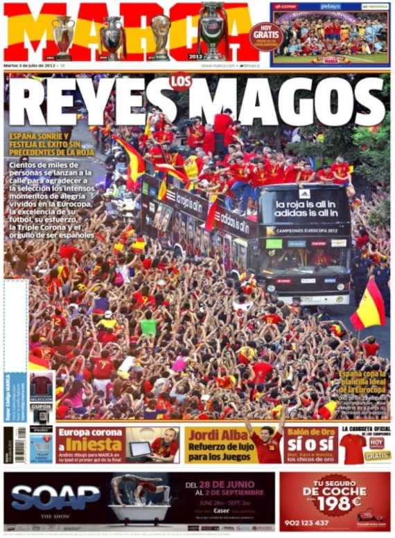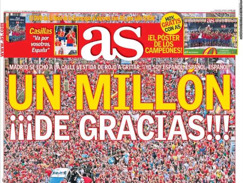 Los diarios generalistas y de información deportiva destacan en sus portadas el baño de multitudes que se dio este lunes la selección española en Madrid para celebrar el título de la Eurocopa.