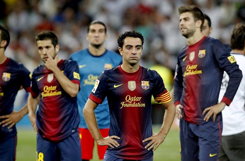 Los jugadores del Barcelona se quedaron sobre el césped del Bernabéu mientras los del Real Madrid recogían la copa en el palco de manos del presidente de la Federación Española de Fútbol, Ángel María Villar.