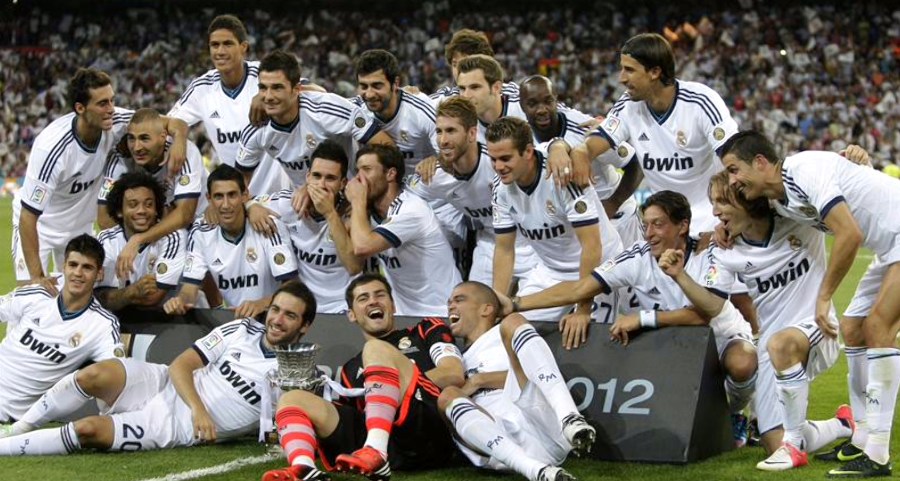 Los jugadores del Real Madrid posan con el título de la Supercopa de España, obtenido tras derrotar (2-1) al Barcelona en un gran partido de vuelta disputado en el Santiago Bernabéu.
