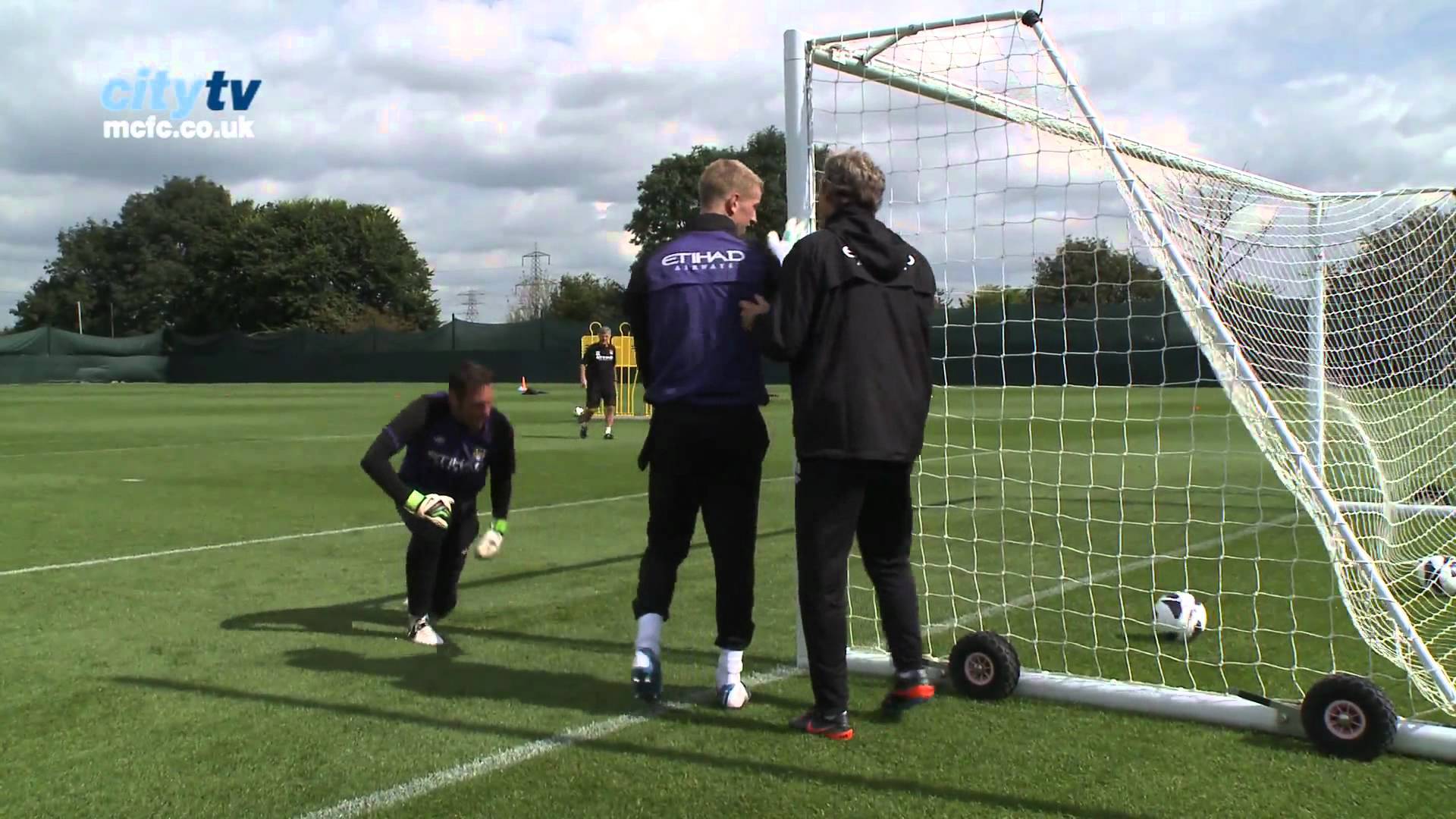 Mario Balotelli, Aleksandar Kolarov, Scott Sinclair y James Milner demuestran su buena portería con lanzamientos a la portería de Joe Hart durante el entrenamiento del Manchester City.