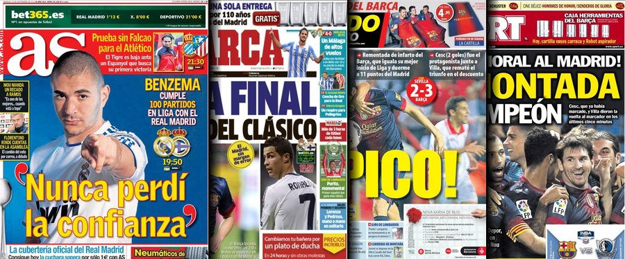 Además, parece excesivo a todas luces que el titular de Sport sea "¡Golpe moral al Madrid", con la imagen del Barcelona celebrando la victoria y la frase "Remontada de campeón", añadiendo además que el Madrid vuelve a estar a once puntos justo antes del clásico.