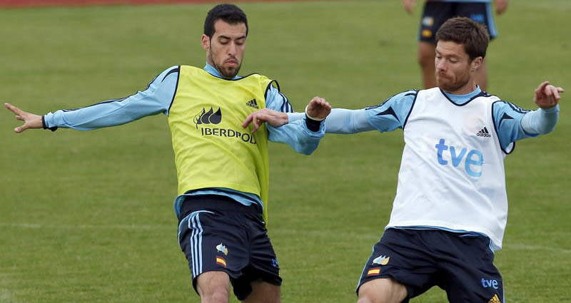 Fueron apenas 45 minutos de entrenamiento pero el seleccionador los aprovechó para repartir petos e incidir en sus ensayos. Busquets parece ganar la partida a Raúl Albiol y Javi Martínez para formar pareja de Sergio Ramos en el centro de la defensa. Santi Cazorla se perfila como el sustituto de Andrés Iniesta y el regreso a la fórmula de la Eurocopa, con falso nueve, se producirá en Minsk si se confirma lo ensayado con Cesc de titular y Fernando Torres en la suplencia.