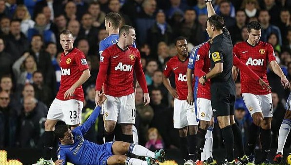 La expulsiones del serbio Branislav Ivanovic y del español Fernando Torres han minado las opciones del Chelsea de imponerse al Manchester United, que remató un encuentro igualado gracias a un gol del mexicano Chicharito Hernández, reclamado como fuera de juego por los blues, a un cuarto de hora del final (2-3).