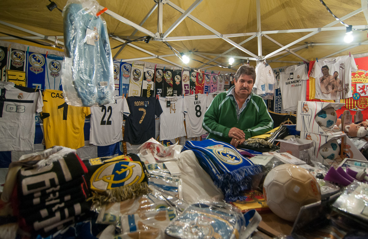 Antonio llevó su puesto de camisetas, bufandas y regalos hasta Alcoy, pero la noche no parecía muy propicia