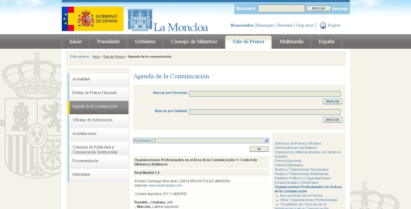 La información falsa del Real Madrid no se encuentra directamente en la portada de la web de La Moncloa, sino que hay que seguir varios pasos. El primero es dirigirse a la selección 'Sala de prensa' y luego pinchar en el apartado 'Agenda de la comunicación'.