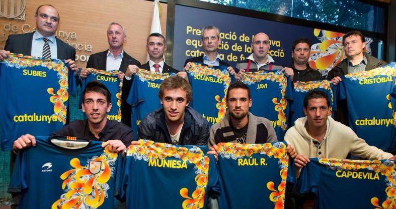 A la presentación de la nueva camiseta, que también será utilizada por las selecciones de fútbol base y de fútbol sala, han acudido, además de Cruyff, el secretario general del deporte de la Generalidad catalana, Ivan Tubau; el presidente de la Federación Catalana (FCF), Andreu Subies; y los futbolistas Isaac Cuenca y Marc Muniesa (Barcelona) y Raúl Rodríguez y Joan Capdevila (Espanyol).