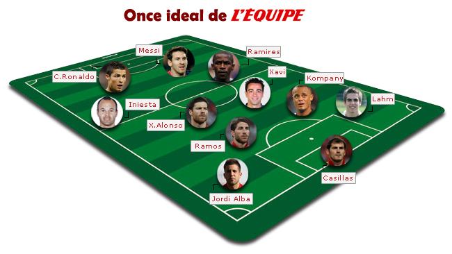 Completan ese equipo ideal, votado por la redacción del periódico deportivo de referencia de Francia, el lateral alemán Philipp Lahm (Bayern de Múnich), el central belga Vincent Kompany (Manchester City) y el centrocampista brasileño Ramires (Chelsea).