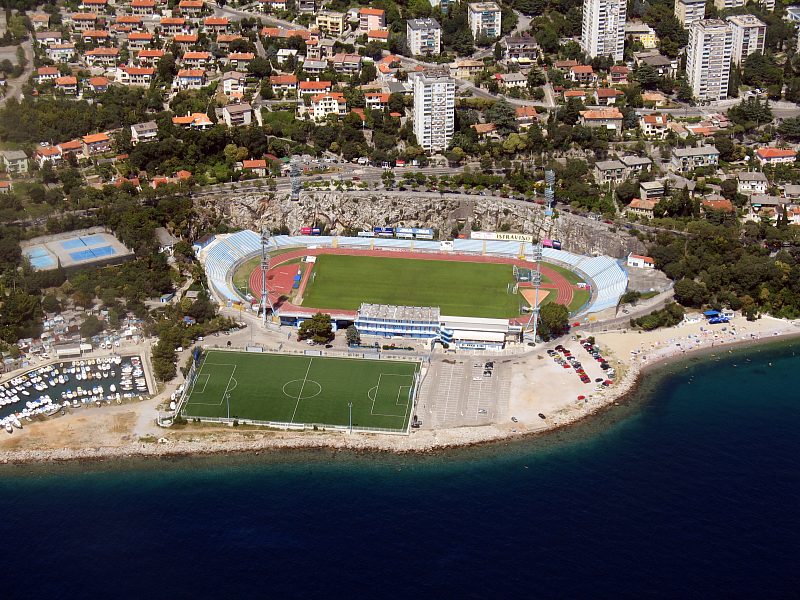 En un emplazamiento también curioso se encuentra el Kantrida Stadion, en Rijeka. Aunque sólo tiene capacidad para 10.600 espectadores, su mágica posición, enclavado entre las montañas y al lado de la playa, hacen de él un recinto más que singular.