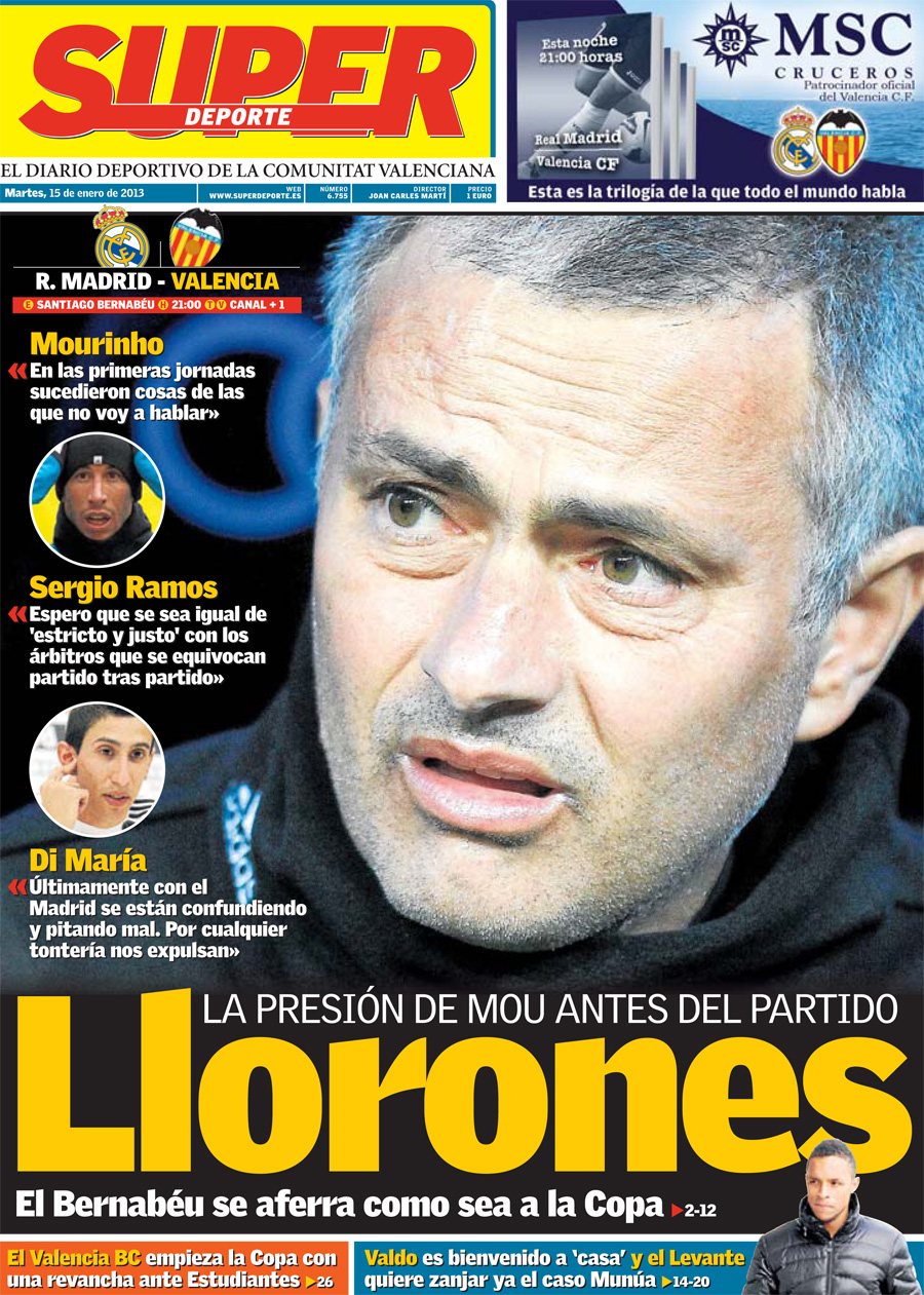 Este martes, a pocas horas del duelo de Copa del Rey que el Madrid y el Valencia disputarán en el Santiago Bernabéu, de ida de cuartos de final, el diario valenciano Superdeporte parece seguir los pasos de sus colegas catalanes y llama "llorones" a los blancos mientras muestra una foto de un compungido Mourinho.