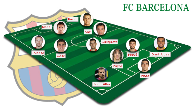 FC Barcelona: Pinto; Dani Alves, Piqué, Puyol, Jordi Alba; Busquets, Xavi, Cesc; Pedro, Messi e Iniesta