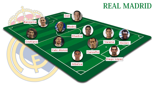 Real Madrid: Diego López o Adán; Essien, Varane, Carvalho, Arbeloa; Khedira, Xabi Alonso, Modric; Özil, Cristiano Ronaldo; y Benzema