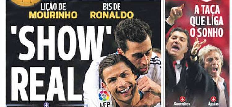 Por su parte, en Portugal hablan de "Show del Real, con doblete de Ronaldo y lección de Mourinho", en A Bola, o "golpe al fútbol de tiki-taka" la exhibición del club blanco ayer y resaltan la superioridad táctica del equipo entrenado por Mourinho.